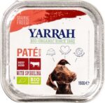 Deze paté voor je hond bevat rund en spirulina. Dit is goed voor een verbeterde weerstand en vitaliteit van je hond. Spirulina bevat bovendien verschillende vitamines en veel eiwitten, die helpen bij een stabiele bloedsuiker en sterke botten. Het diervoer van Yarrah wordt gemaakt van biologisch gecertificeerde ingrediënten en bevat geen onnatuurlijke kleur-, geur- of smaakstoffen. Beter voor jouw dier, beter voor álle dieren!